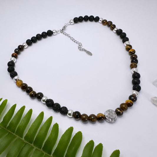 NOVEMBER - Tigerauge & Lavastein - Halskette Flower Of Life